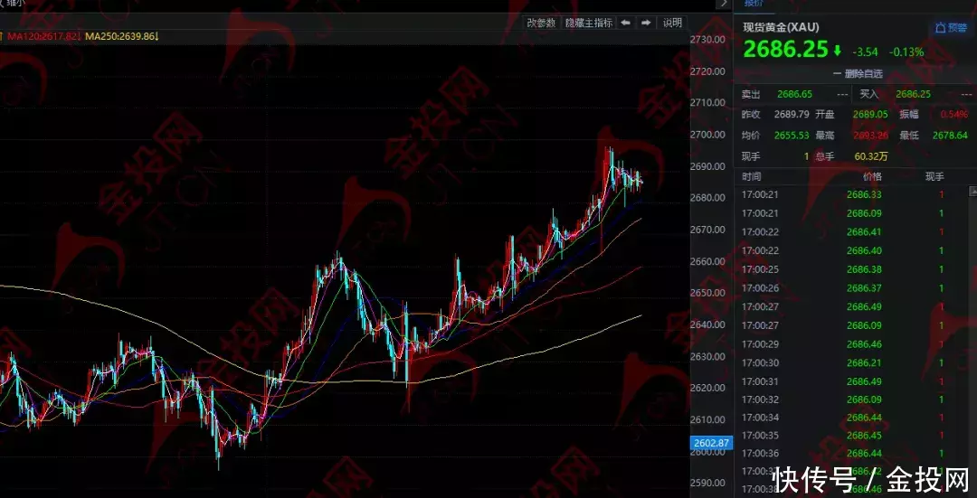 上周五,现货黄金剧烈震荡,盘中一度跌破2670关口,而后强势收复全部失地,并一度逼近2700美元关口,最终收涨0.75%,报2689.88美元。今日欧市盘中,黄金小幅下跌,目前在2685美元附近徘徊。